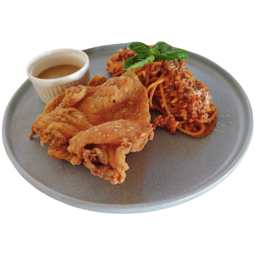 Crispy chicken served with flavorful spaghetti and hearty meat sauce
